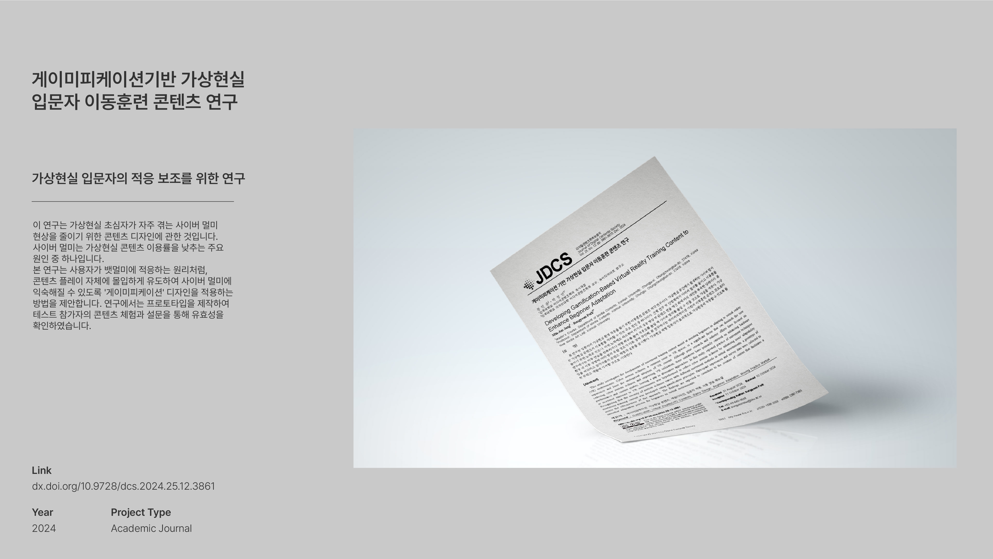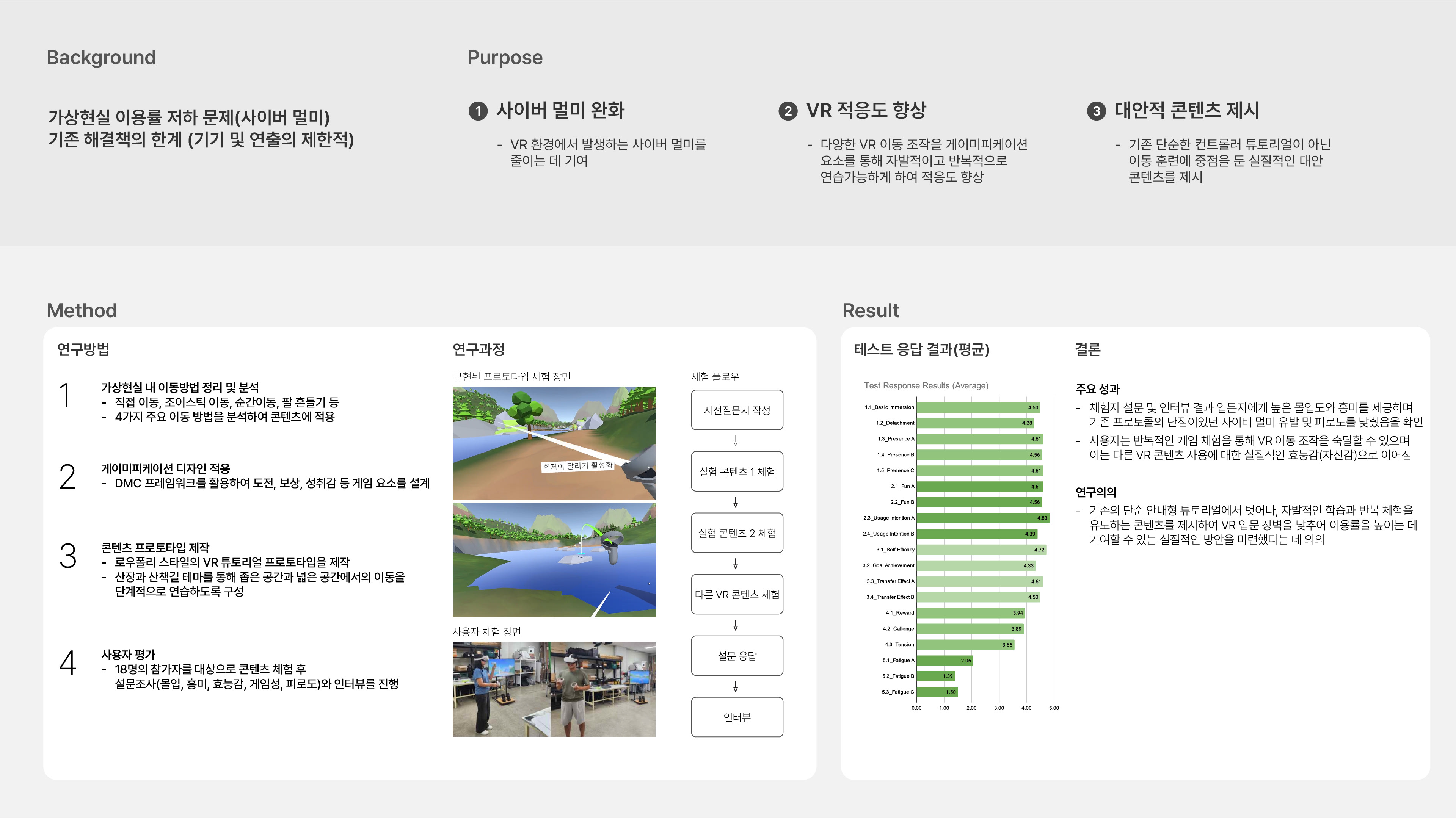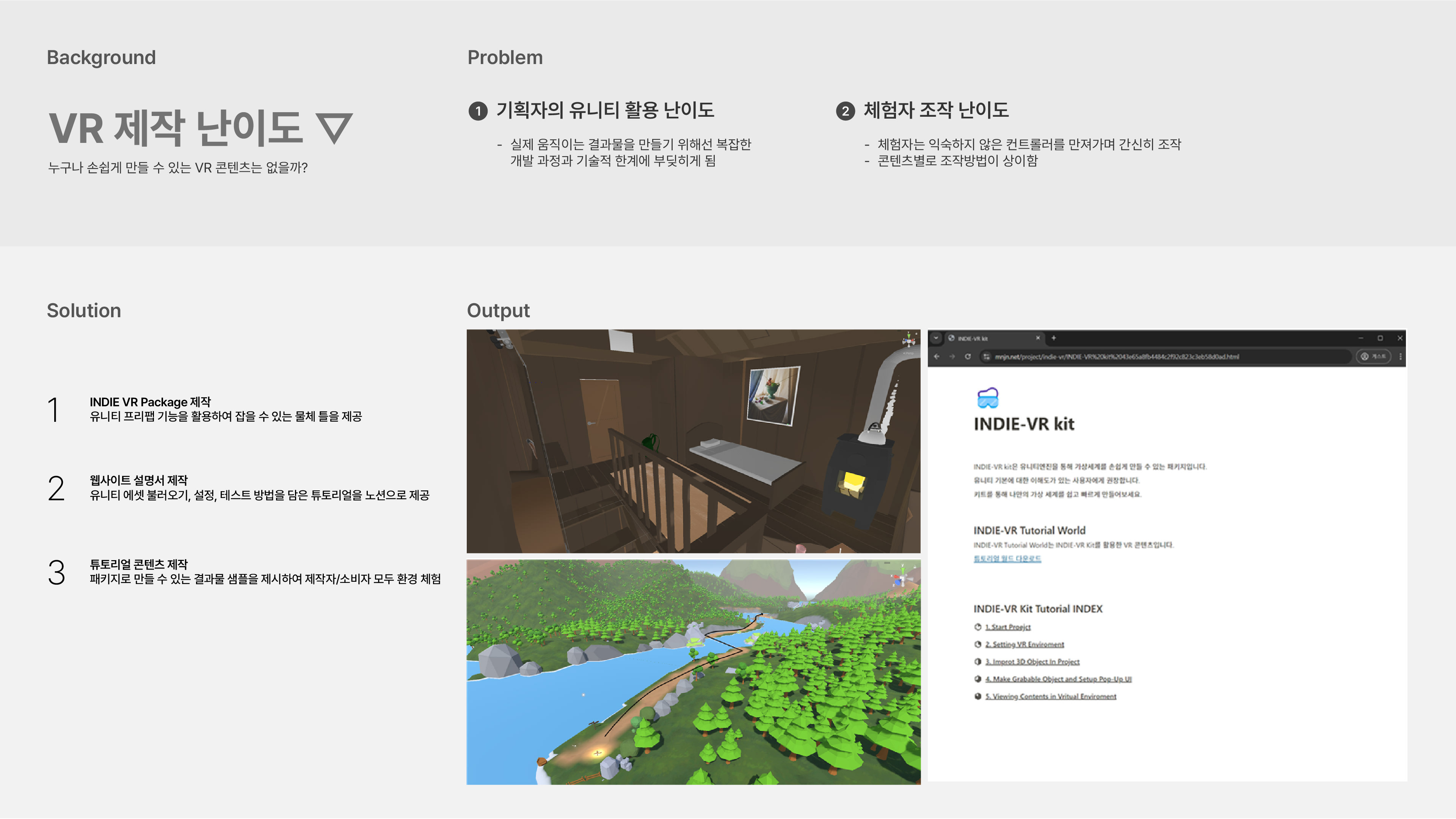 소개 : INDIE VR 패키지와 튜토리얼 월드는 손쉽게 구축할 수 있는 가상현실 세계의 가능성 탐구에서 시작한 프로젝트다. 가상현실 환경에서 주된 조작이 이루어지는 것을 VR 디바이스의 입력장치와 입력방법, 가이드라인 등을 기반으로 분석하였다. 이후 Unity Engine을 활용한 에셋 패키지인 INDIE VR 패키지를 제작한다.
