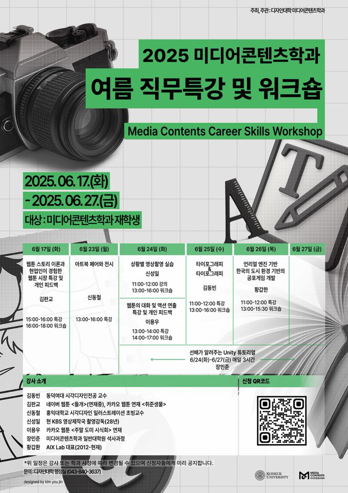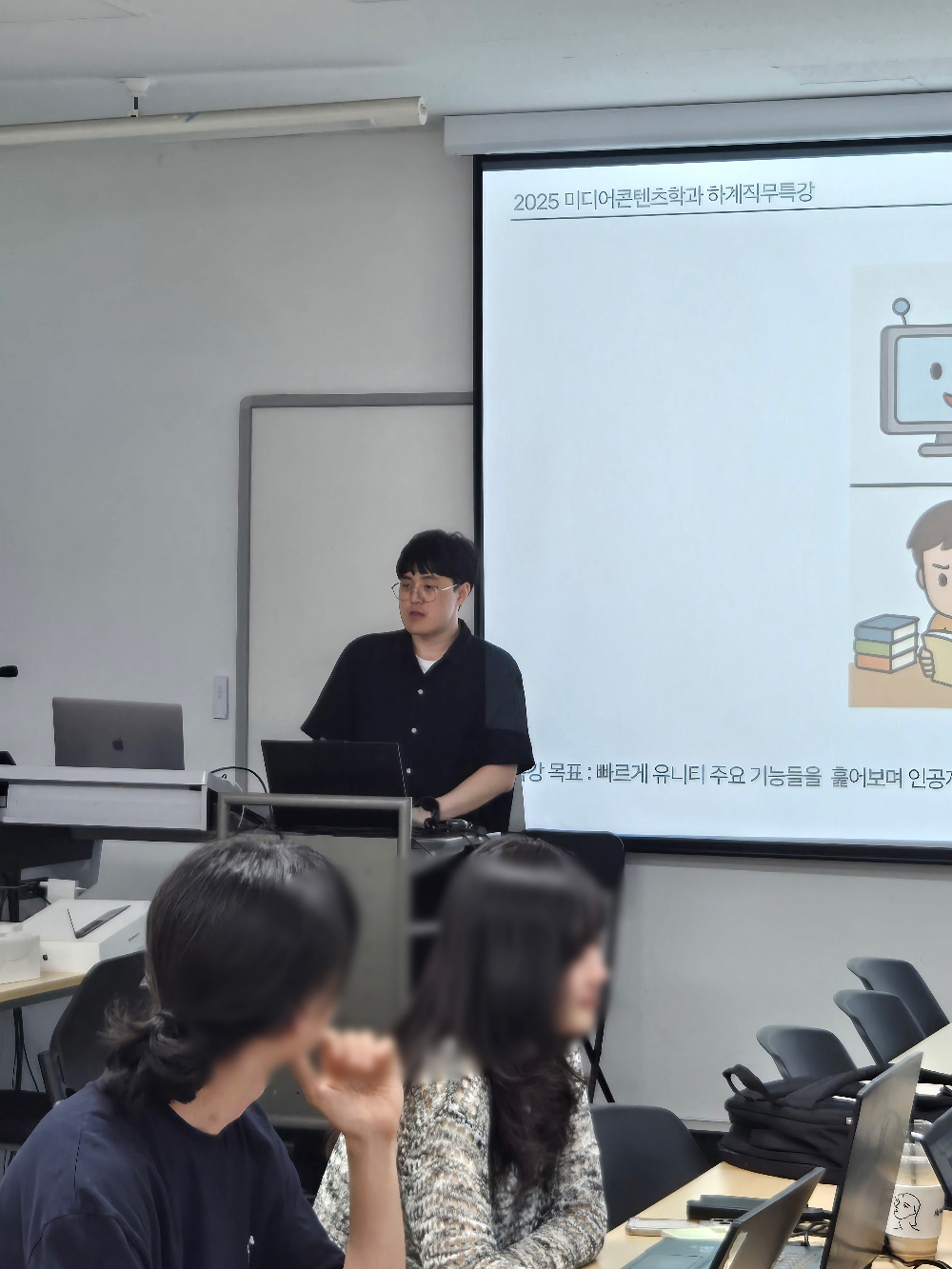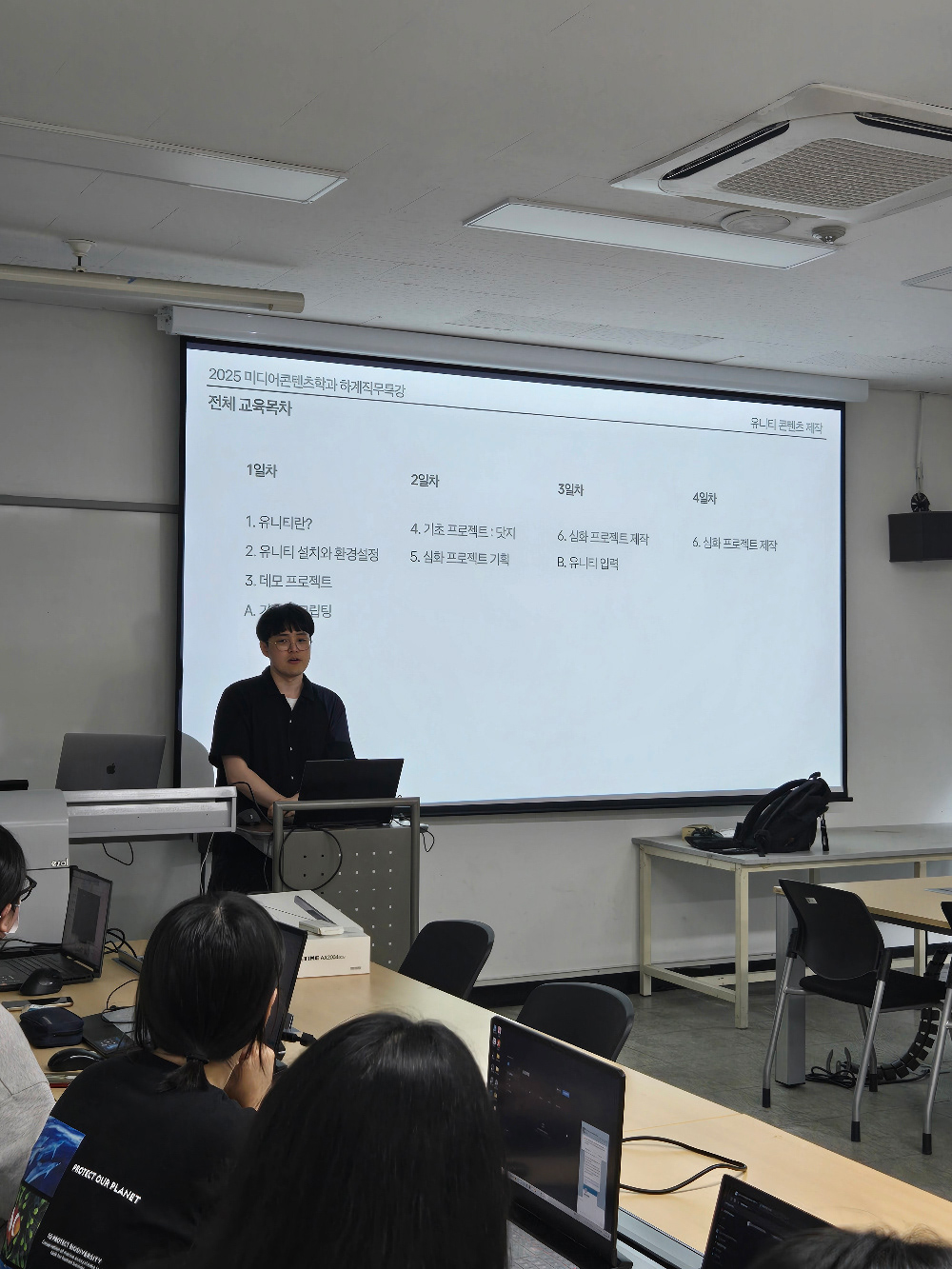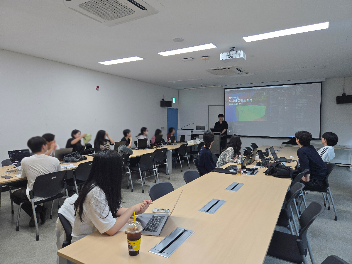 건국대학교 글로컬캠퍼스에서 진행하는 '2025 미디어콘텐츠학과 여름방학 직무 특강 및 워크숍'에 '선배가 알려주는 Unity 튜토리얼' 이라는 워크숍을 2025년 6월 24일부터 4일간 매일 3시간, Unity Engine의 기본 사용법과 기초 스크립팅의 내으로 특강을 진행했습니다.